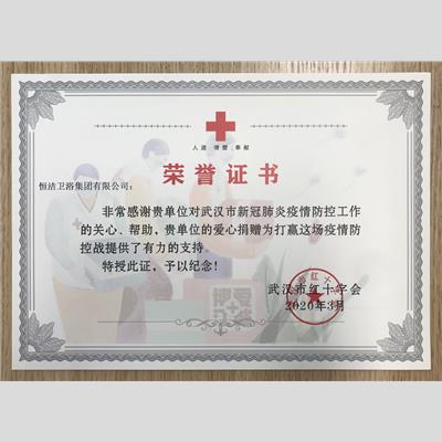 獎 項:恒潔-武漢紅十字會愛心捐贈榮譽證書
