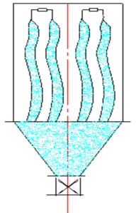 含塵氣體由進氣口進入灰斗或儲灰箱,通過花板孔或直接通過花板孔三種方式進入濾袋。如圖2a、b、c所示,含塵氣體透過濾袋變為凈氣,進入箱體,再經箱體上部排氣口,由風機排走。粉塵積附在濾袋的內表面,且不斷增加,使袋收塵器的阻力不斷上升。當阻力上升到1500—2000Pa時為了使袋收塵器繼續工作,需定期清除濾袋上的粉塵。具體清灰時,首先關閉頂上風機,搖動電機上偏心作用,帶動連桿,使搖動軸左右來回轉動,濾袋就呈波紋狀態,使粉塵掉下,卸出。清灰狀態如圖3所示。