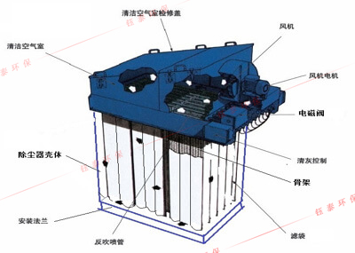 含塵空氣由風口進入除塵器箱體內,細小塵粒由于濾袋的多種效應作用,被滯阻在濾袋外壁。凈化后的氣體通過濾袋從上箱體出風口排出。隨著使用時間的增長,濾袋表面吸附的粉塵增多,濾袋的透氣性減弱,使除塵器阻力不斷增大。為保證除塵器的阻力控制在限定的范圍之內,由脈沖控制儀發出信號,循序打開電磁脈沖閥,使氣包內的壓縮空氣由噴吹管各噴射到對應的骨架(稱為一次風),并在高速氣流通過骨架時誘導數倍于一次風的周圍空氣(稱為二次風)進入濾袋,造成濾袋瞬間急劇膨脹,由于反向脈沖氣流的沖擊作用很快消失,濾袋又急劇收縮,這樣使積附在濾袋外壁上的粉塵被清除。由于清灰是依次分別向幾組濾袋進行,并不切斷需要處理的含塵空氣,所以在清灰過程中,除塵器的處理能力保持不變。